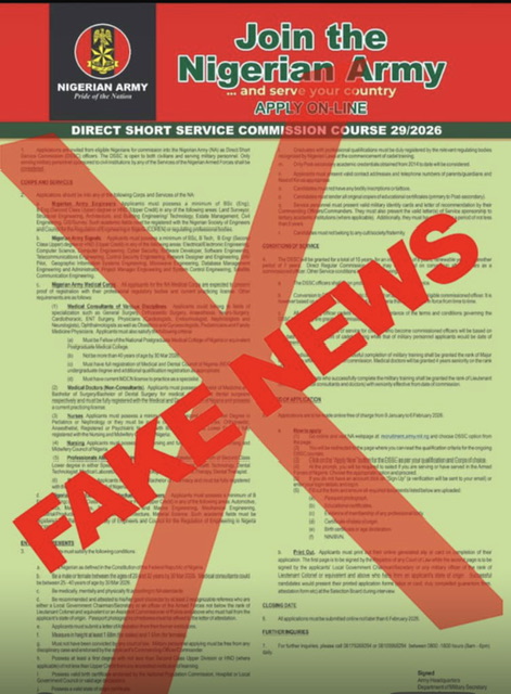 The Nigerian Army, has dismissed advertisement circulating on social media and other online platforms, claiming that the Nigerian Army Direct Short Service Course, DSSC 29 application form for 2026, is available.