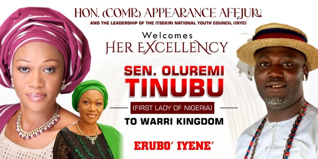" The Itsekiri National Youth council INYC, under the leadership of Comr. Appearance Afejuku Special, invite all sons and daughters of Warri Kingdom as they heartily welcome Her Excellency , Sen. Oluremi Tinubu,The First Lady of Nigeria to the Olu of Warri Palace," the statement, noted.