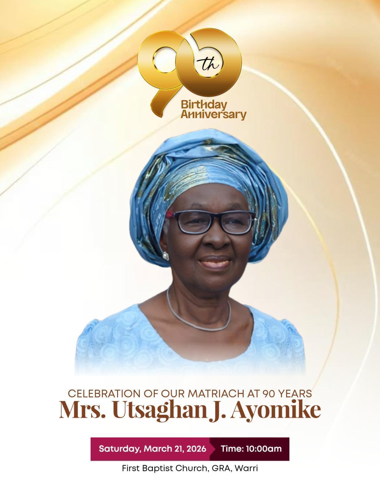 Nanna family of Warri Kingdom, has celebrated Mrs. Utsaghan J. Ayomike, on the celebration of her 90th birth anniversary today, Saturday March 21.